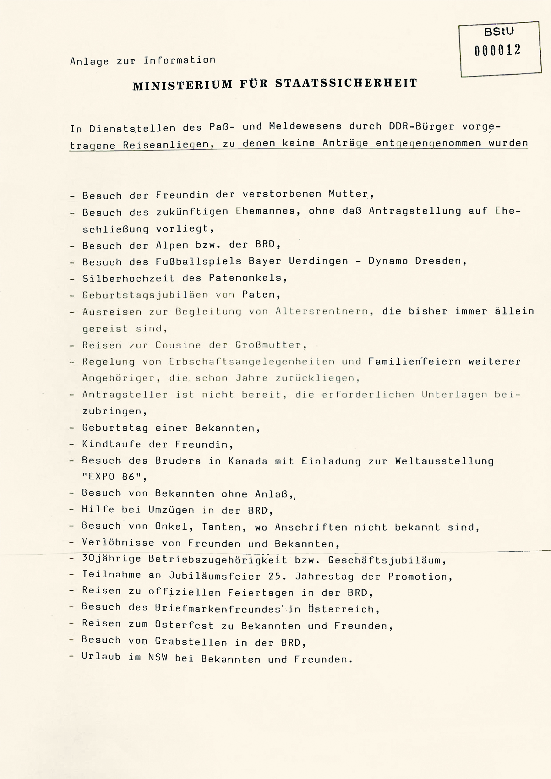 Darüber hinaus spricht eine Vielzahl von Bürgern der DDR in den Dienststellen des Pass- und Meldewesens der Deutschen Volkspolizei vor und besteht auf der Entgegennahme der Antragsunterlagen, obwohl kein Anliegen im Sinne einer dringenden Familienangelegenheit vorliegt und die Reisewünsche auch weit über die erweiterten Genehmigungsmöglichkeiten hinausgehen (Auswahl derartiger Reisewünsche – siehe Anlage).