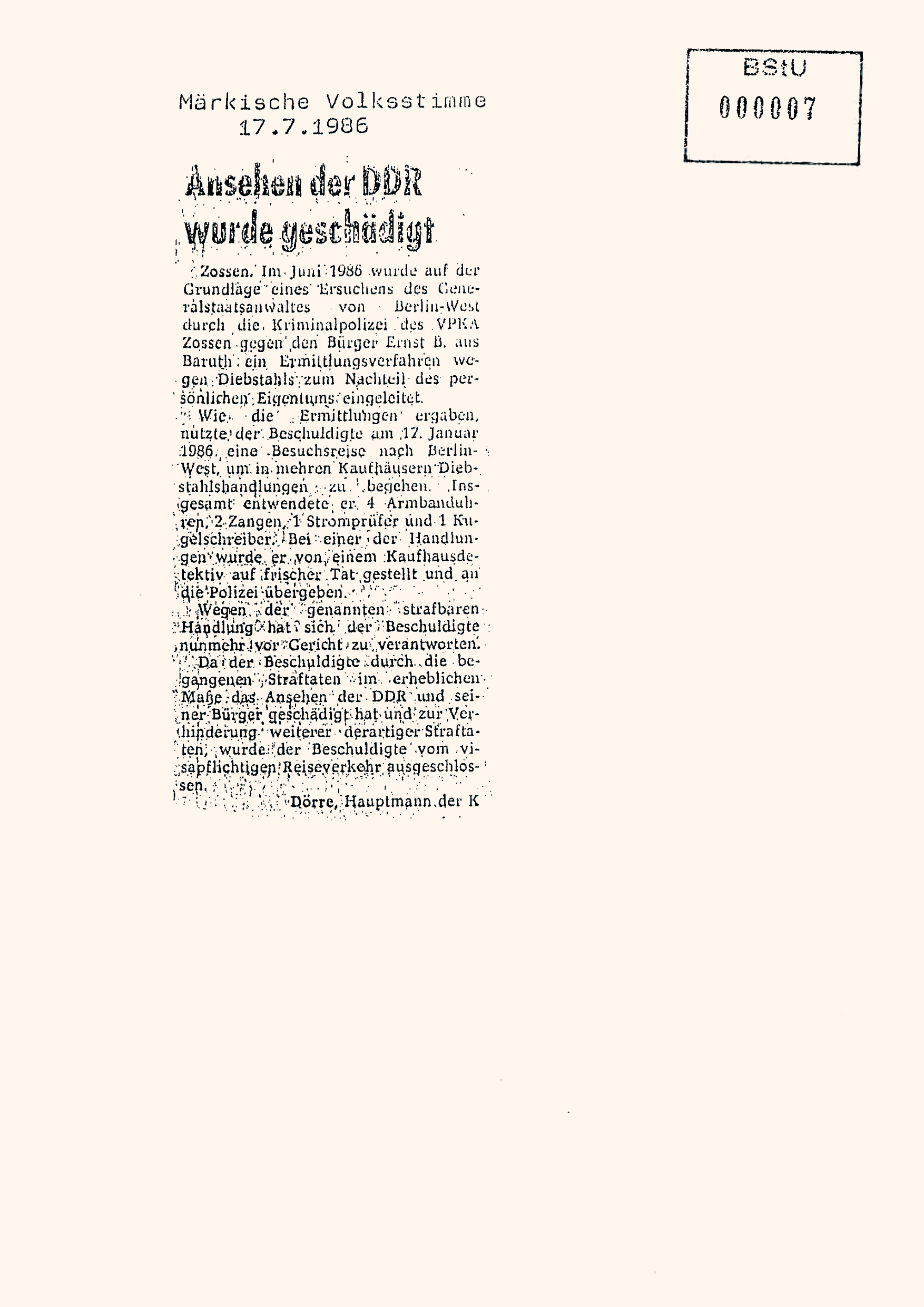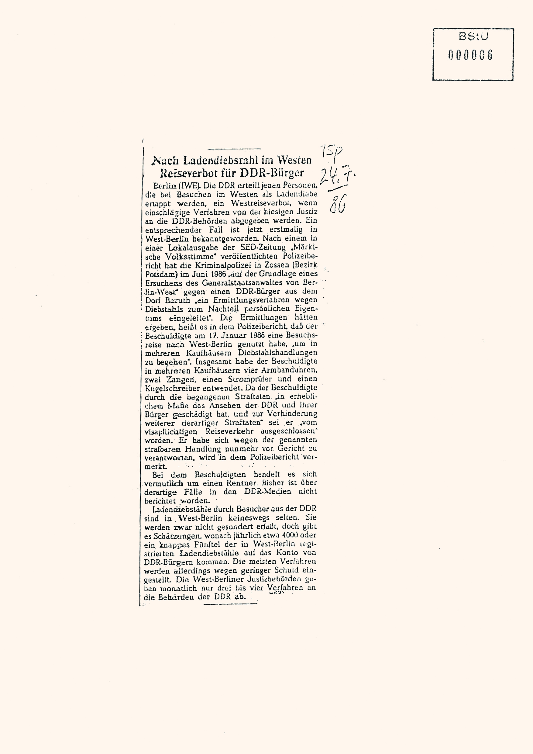 zu Bericht K 1/165 Faksimile von Zeitungsausschnitt »Nach Ladendiebstahl im Westen Reiseverbot für DDR-Bürger« zu Bericht K 1/165 Faksimile von Zeitungsausschnitt »Ansehen der DDR wurde geschädigt« zu Bericht K 1/165